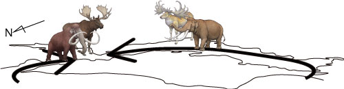 ヘラジカ・マンモスが北海道以北に、オオツノジカ・ナウマンゾウが北海道以南にほぼ分布しました。