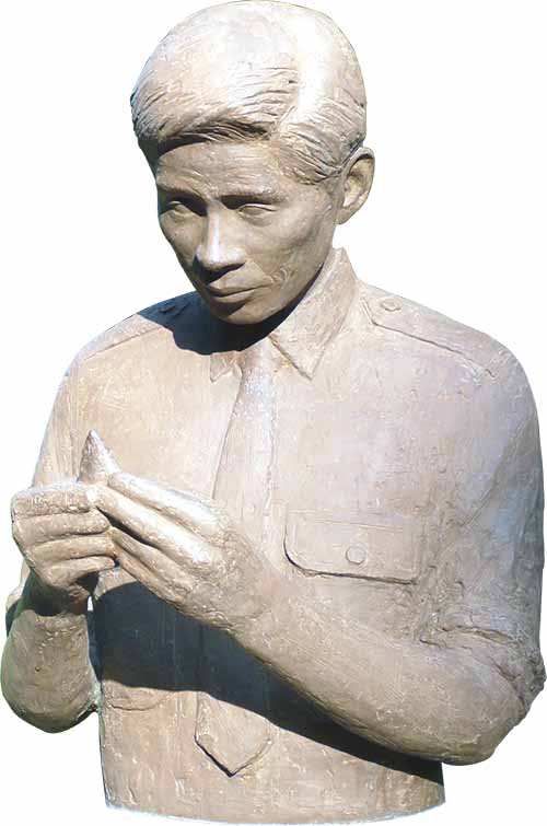 批難に屈しない考古学への情熱―相沢忠洋独学の末に石器を発見した相沢忠洋は、1949年に明治大学の学者たちと岩宿遺跡を調査、日本の旧石器時代の存在を証明しました。しかし、報告は大学の名義でなされ、相沢は調査の単なる付き添い役として、学界から存在を無視されました。加えて、功績をねたむ学者・地元住民から売名行為と批難を浴びました。その後も相沢はアマチュアとして地道な調査活動を続け、多くの遺跡発見に貢献しました。やがて相沢への批難は消え、正当な評価がなされました。下図は岩宿遺跡の相沢の像。常識を覆した石器を手に、じっと見つめています。