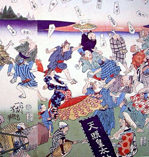 1867年8月から翌年にかけ、徳川氏の天下が崩れて世が変わっていく状態を、民衆が「ええじゃないか」と歌いあげ、はやし立てる集団乱舞が発生しました。