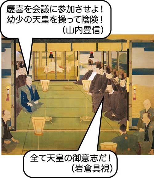 徳川慶喜抜きで開かれた、三職による会議慶喜に辞官納地(内大臣の辞退と領地の一部返上)を命令