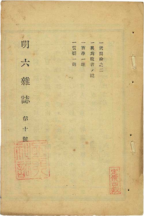 1873年、洋学者らが啓蒙的思想団体明六社を組織し、機関誌『明六雑誌』を出版して西洋思想の普及に努めました。