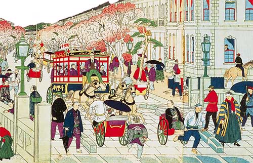 富国強兵は、殖産興業のほかに、西洋文明の導入でも目指されました。この動きは、江戸時代の文化を全面的に否定する急進的なものでした。しかし、明治維新から間もない時期で、前時代の古さと新時代の新しさが共存している状況でした。むしろ、この奇妙な混合が、旧来の日本人に風味のある異国趣味として受容されました。文明開化