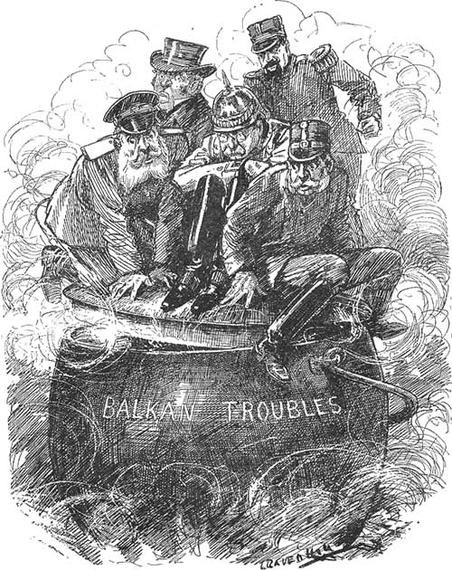 ロシアの南下政策、イギリスの政策、ドイツの政策、オーストリアのバルカン半島進出など、ヨーロッパの諸問題・関心はバルカン半島に凝縮されていました。図は今にも爆発しそうなバルカン半島の問題に蓋をしようとする列強を描いています。左から順に、ロシア・イギリス・ドイツ・イタリア・オーストリアです。