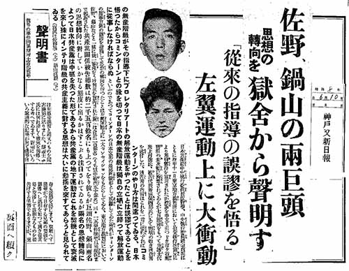 1933年、獄中の日本共産党幹部の佐野学・鍋山貞親が、現国家体制を支持する転向声明書を発表しました。