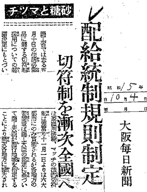 1940年、砂糖・マッチの切符制開始