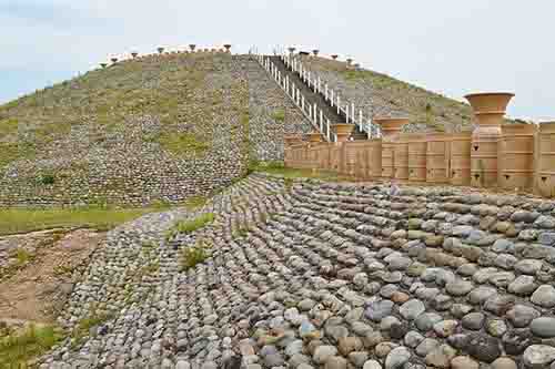 - 斜面に葺石ふきいし、丘の部分に土製の焼き物 埴輪